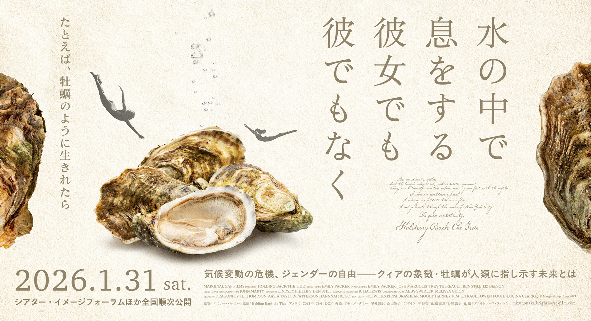 「海のミルク」と呼ばれ人々の舌を惹きつけて止まない牡蠣。だが牡蠣の役割はそれだけはでない。牡蠣は呼吸することによって⽔を濾過し水質を改善する。集団を好みくっつきたがる性質もあり、牡蠣が集まってできた「牡蠣礁」は微生物や甲殻類、小魚たちの住処となる。そして、更なる特別な性質として、繁殖の為に、自身の性別を変えることもある。